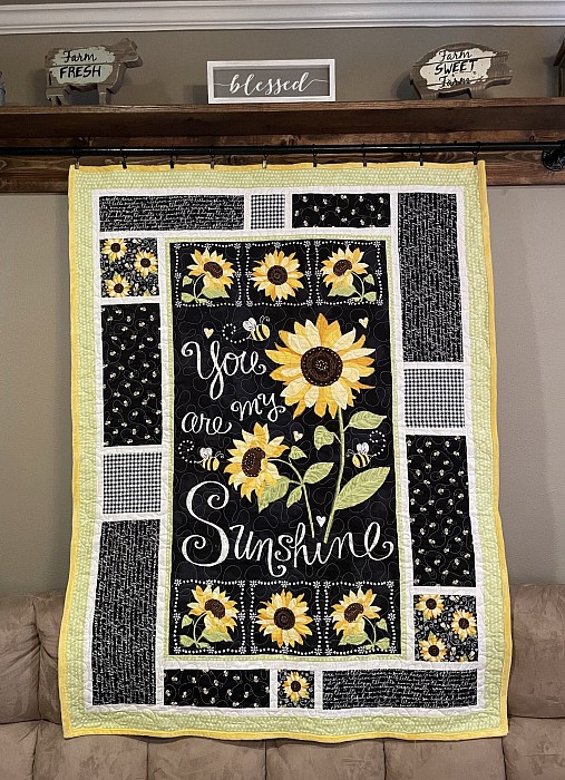 This cute throw is made using Hello Sunshine fabrics by Timeless Treasures and Message Board patten by Jill Boyd. It’s approximately 43 x 56.5 inches. This one is backed with yellow Minky and is for sale.